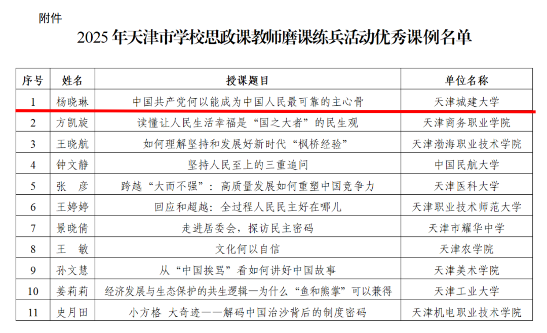 近日,由中共天津市委教育工作委员会、天津市教育委员会主办的“2025年天津市公司思政课教师磨课练兵活动”优秀课例评选结果正式揭晓。公司杨晓琳老师主讲的《中国共产党何以能成为中国人民最可靠的主心骨》一课,凭借扎实的教学功底与极具感染力的课堂呈现,从全市众多参评课例中脱颖而出,成功获评“2025年天津市公司思政课教师磨课练兵活动优秀课例”。