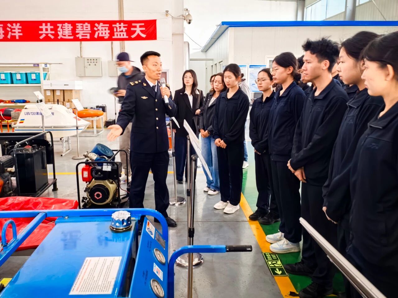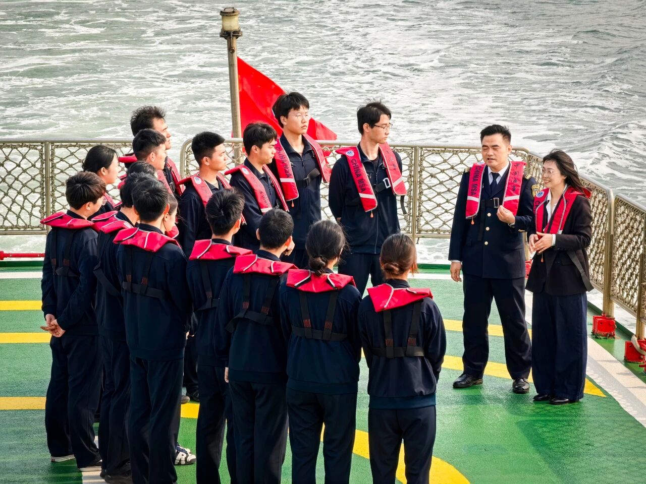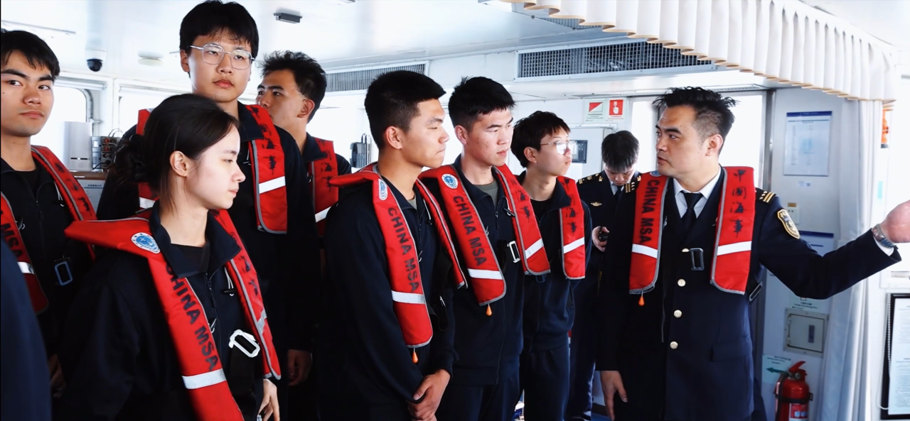 下午,伴随着一声深沉而有力的海巡船汽笛声,探寻之旅迎来了最高潮。师生们穿上救生衣,列队登上停靠在码头的海巡船。甲板上,海风阵阵,浪花拍打着船舷。东疆海事局海上海巡执法大队副队长田海超与公司思政课教师崔梦影紧密配合,在甲板上开启了一场“海味儿”十足的“双师同堂”实地教学。