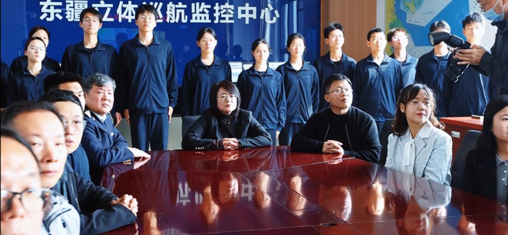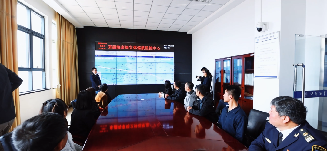 人民城市的高质量发展,离不开科技化治理的保驾护航。走出会议室,师生们的探寻脚步迈入了充满现代科技气息的实地参观区。在立体巡航中心,一整面巨大的电子屏幕闪烁着幽蓝的光芒,密密麻麻的船舶AIS轨迹如同跳动的血脉,清晰勾勒出港口航道的动态全景。东疆海事局的讲解员指着屏幕,向大家展示了“全方位覆盖、全天候运行”的信息化动态监管网络。员工们目不转睛地看着这些跃动的数据,直观感受到它们正是守护人民城市运转的“智慧之眼”。