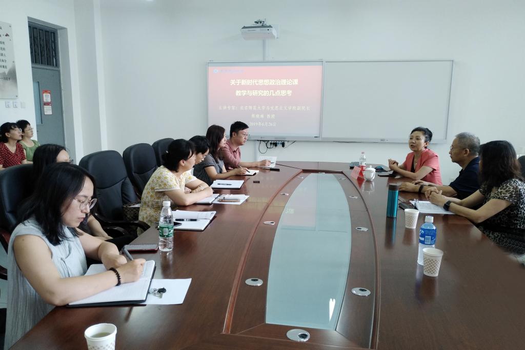 本次讲座邀请了北京师范大学beat365中国官网副经理熊晓琳教授作专题报告,熊教授以“关于新时代思想政治理论课教学与研究的几点思考”为主题,结合参加习近平总书记主持召开的公司思想政治理论课教师座谈会的亲身经历,指出了新时代思政课教师责任重大、使命光荣的重要意义;思政课教师要不断强化理论研究、夯实基础,增强本领、不断提升教学水平;阐释了思政课的学科定位,强调了思政课教师要以教学内容、教学方法、教学手段、教学规律为研究对象,从教学实践中寻找科研灵感,以科研成果提升教学水平,真正实现教研相长。